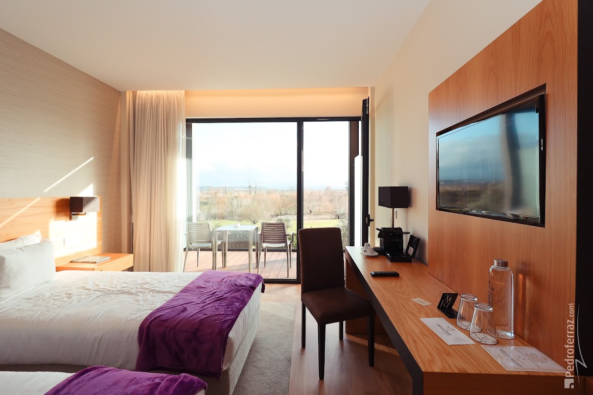 Modern, clean and bright hotel (only a year old). All rooms have balconies and big doors facing the countryside views and wildlife. The front desk staff are extremely helpful and will gladly lend you anything that you need for the room (kettle etc) Good buffet breakfast and meals by the pool and bar are good quality and not too over inflated in price for a hotel. Next to a road so not totally silent but generally a good relaxing place to stay.